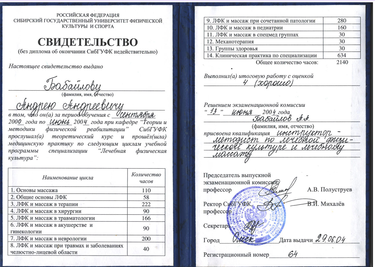 2004-2009 гг. — Центр кинезиотерапии С.М. Бубновского –старший инструктор-методист по кинезиотерапии.