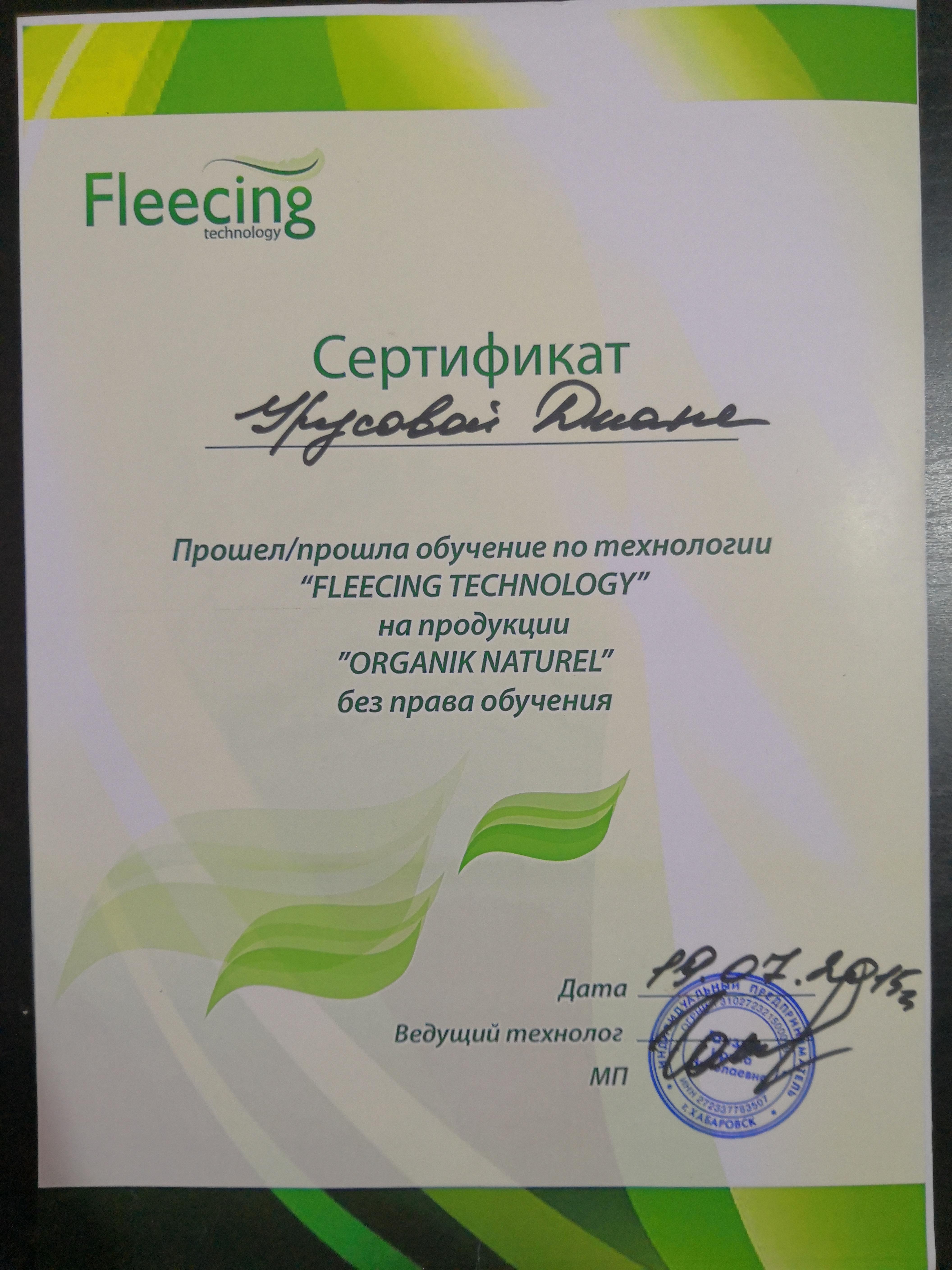 2015 г. – Прошла обучение по технике «FLEECING TECHNOLOGY» на продукции «ORGANIC NATUREL»