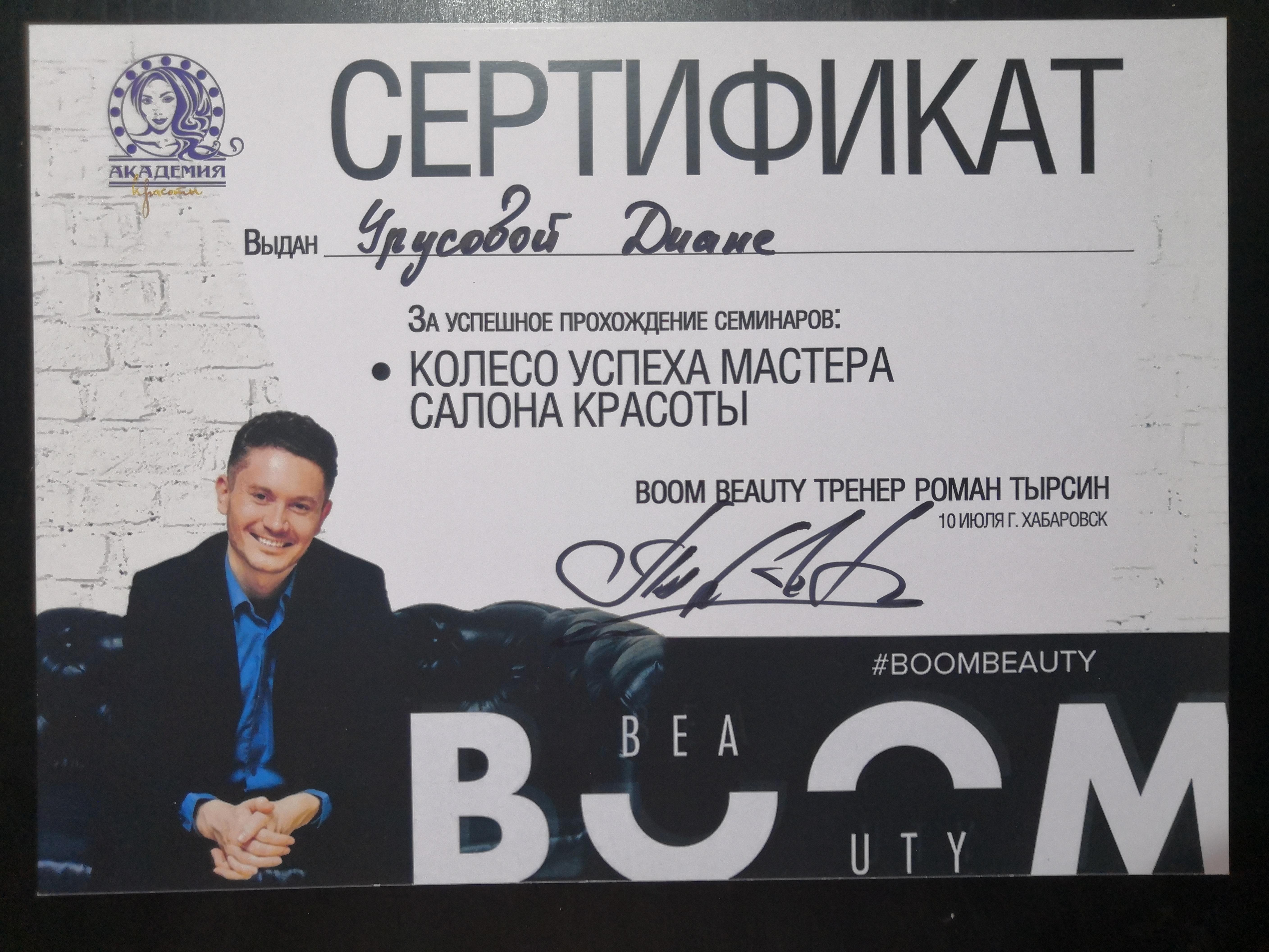 2018 г. – Прошла серию семинаров «КОЛЕСО УСПЕХА МАСТЕРА САЛОНА КРАСОТЫ», «Академия красоты», г. Хабаровск